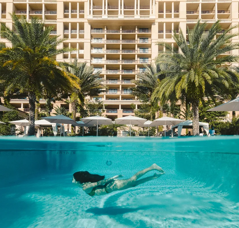 Good: “Woman underwater in swimming pool, surrounded by hotel building.